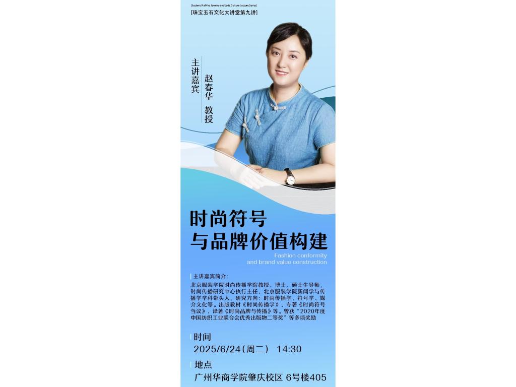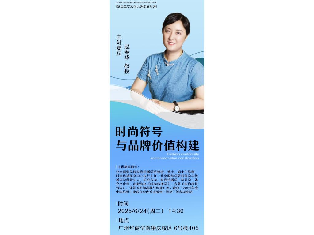 珠宝玉石文化大讲堂第九讲即将开讲!作为第二届华商珠宝文化节的重要内容,本次学术讲座,我们有幸邀请到北京服装学院时尚传播学院赵春华教授,她将给广大师生带来专题讲座《时尚符号与品牌价值构建》,带你解码时尚符号密码,洞悉品牌价值构建逻辑,热爱时尚、关注品牌文化传播的学子,不可错过!一、讲师风采 赵春华教授是北京服装学院时尚传播学院教授、博士、硕士生导师,身兼时尚传播研究中心执行主任、新闻学与传......