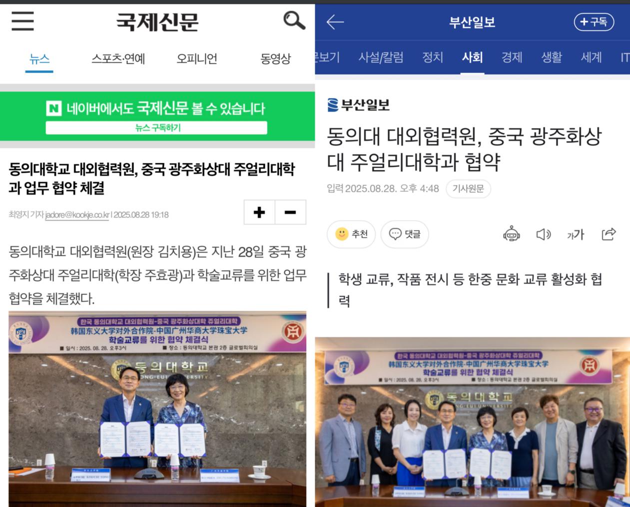 在东义大学交流期间,朱晓红院长携副院长李苗教授、华商产教融合创新中心主任星亮教授,与东义大学对外合作院院长金致龙教授、设计系崔允贞教授、广告系主任朴恩珠教授及赵璟燮教授等核心团队举行专题座谈会。双方围绕专业建设优化、创新人才联合培养、师生跨境互访、优秀创意作品联展等关键议题展开深入研讨,达成多项共识,并正式签署战略合作协议。根据协议,两校将在中韩文化交融、高等教育协同发展、学术研究共建等领域推进实质性合作,为师生打造更广阔的国际化发展平台。此次签约仪式受到韩国主流媒体高度关注,《釜山日报》《釜山国际新闻报》均进行了专题报道,进一步扩大了两校合作的国际影响力。
