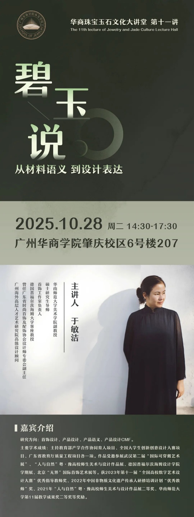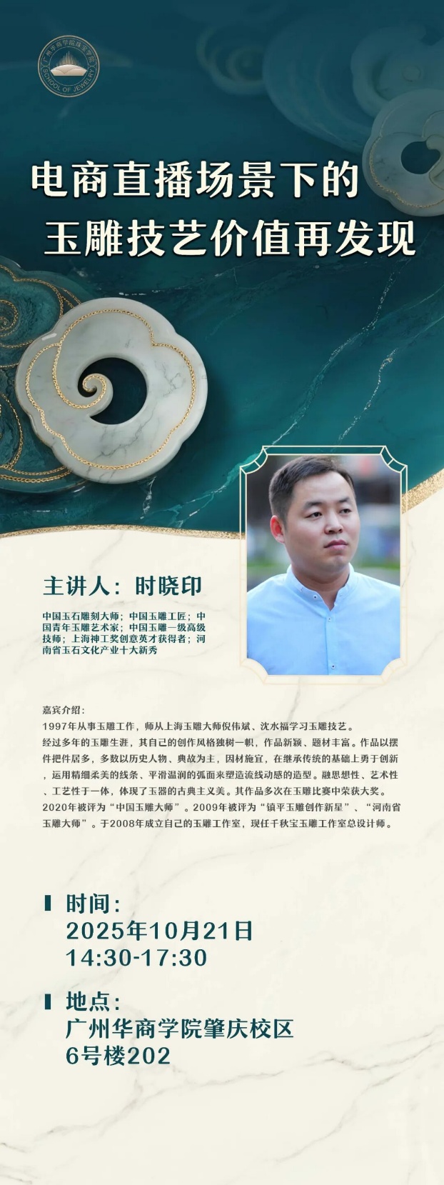 3.“珠宝玉石文化大讲堂”品牌化:本年度共举办大讲堂5讲,先后邀请丘志力教授(中山大学,讲珠宝评估)、于敏洁副教授(华南师大,讲碧玉设计)、赵春华教授(北京服装学院,讲时尚品牌)、时晓印大师(讲玉雕直播)、廖锦文大师(四会玉雕传承人)等开讲,每场讲座均设深度互动环节,累计覆盖师生超500人次。
