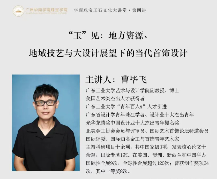 11月09日,华商学院珠宝学院 “华商珠宝玉石文化大讲堂” 第四讲,邀请了曹毕飞副教授前来授讲,此次以“玉”为主题的「“玉”见:地方资源、地域技艺与大设计展望下的当代首饰设计」的讲座,吸引了众多同学前来听取。同学们也为曹老师的到来,献出了最热烈的掌声。