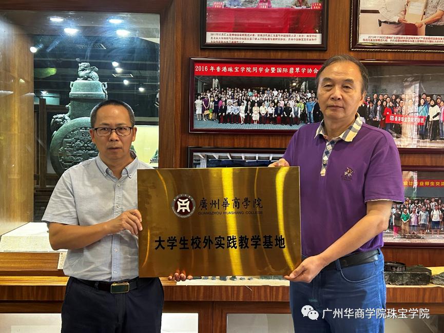 王列耀副校长向汇玉堂国际文化博物馆授予了“广州华商学院大学生校外实践教学基地”牌匾,并向汇玉堂国际文化博物馆负责人张锦洪颁发了“广州华商学院珠宝学院客座教授”证书。