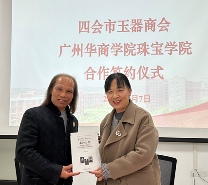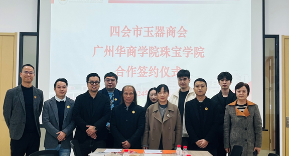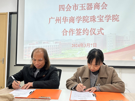 珠宝学院和四会市玉器商会于3月7日在华商学院肇庆校区正式签署战略合作协议。签约仪式上,朱晓红院长对廖锦文会长一行莅临华商珠宝学院表示热烈欢迎,对双方强烈的合作愿望予以高度评价,认为共同的目标就是为业界做事,实现业界优势和学界优势的联合,共同服务当地经济发展。廖锦文会长表示,四会市是中国著名的玉器之乡,是中国重要的玉器商都,四会玉器商会承担着把玉器珠宝文化和技艺发扬光大的重要职责,这次来到珠宝学院,就是想与学界合作,希望通过学院把玉器的文化和技艺发扬光大,在共同培养珠宝玉器产业人才方面取得好的合作成果。四会玉器商会秘书长张祖瑞向大家介绍了商会的八个委员会和五大部门,阐述了珠宝产业丰富的产业链和学生未来宽广的就业前景。张秘书长还提出了商会与学院共建合作一些具体项目的设想,得到了珠宝学院领导的积极回应。签约仪式结束后,珠宝学院教师和玉器商会的业界专家还就珠宝玉器的设计、美学、文化和经营等方面进行了深入的互动交流。